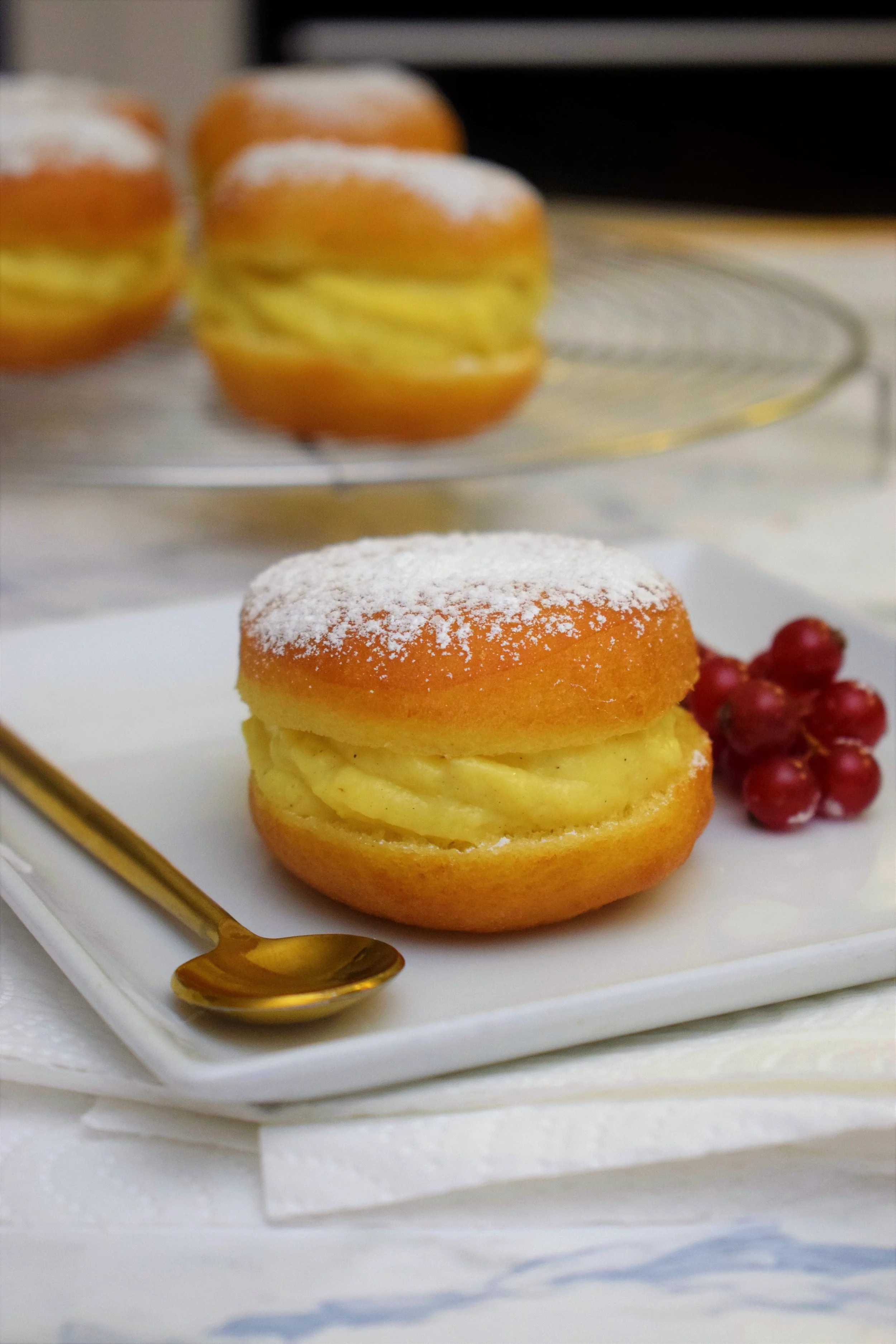 Garnissez les beignets de crème et saupoudrez de sucre glace.